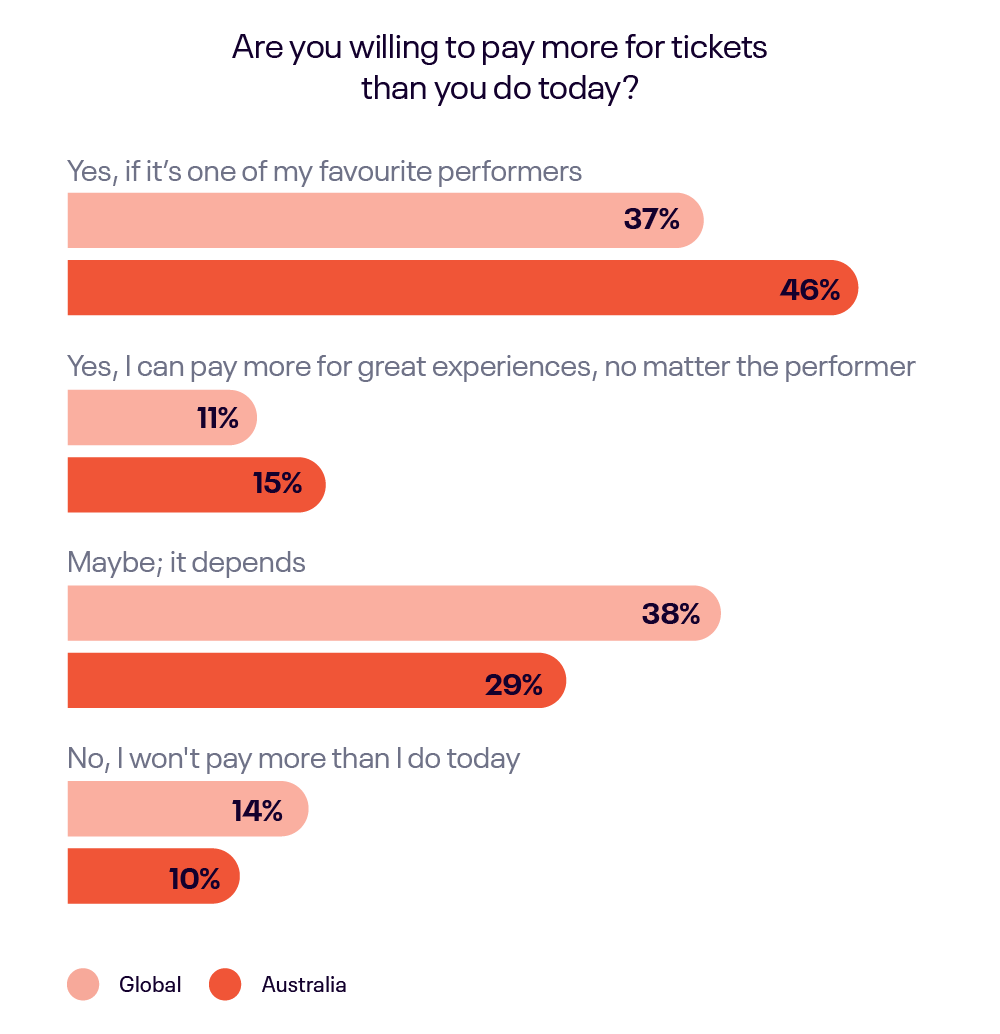In fact, the overwhelming majority (90%) of Australian music fans expect inflation to drive up ticket prices in 2023, but nearly half (46%) confirmed that they are willing to pay more for their favourite performers. A further 15% are prepared to pay more for great experiences “no matter the performer”, while 29% said they might pay more for gigs – “it depends”. (Presumably on the performer, event location, and other factors or inclusions that might entice them to splurge.)