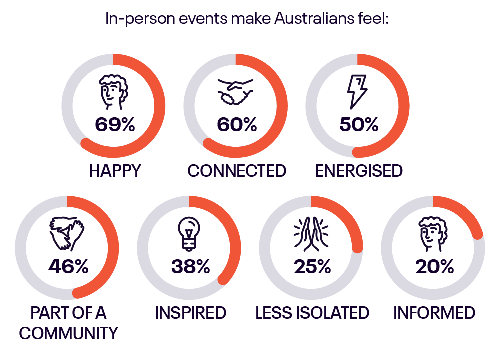 Post-pandemic, almost one in four (24%) Australians surveyed said they “almost always” or “often” feel socially isolated and/or lonely, and another 38% “sometimes” do. But going to in-person events helps – nearly two-thirds (62%) of Australian respondents agreed that it makes them “feel less isolated/lonely”.
