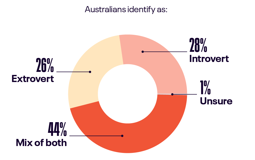 Over a quarter (28%) of Australians surveyed identify as introverts, which is just shy of the global average of 30%. (For the survey, we defined the terms as: “Extroverts tend to feel energised by social time with others; introverts tend to prefer spending time alone or in small groups.”)